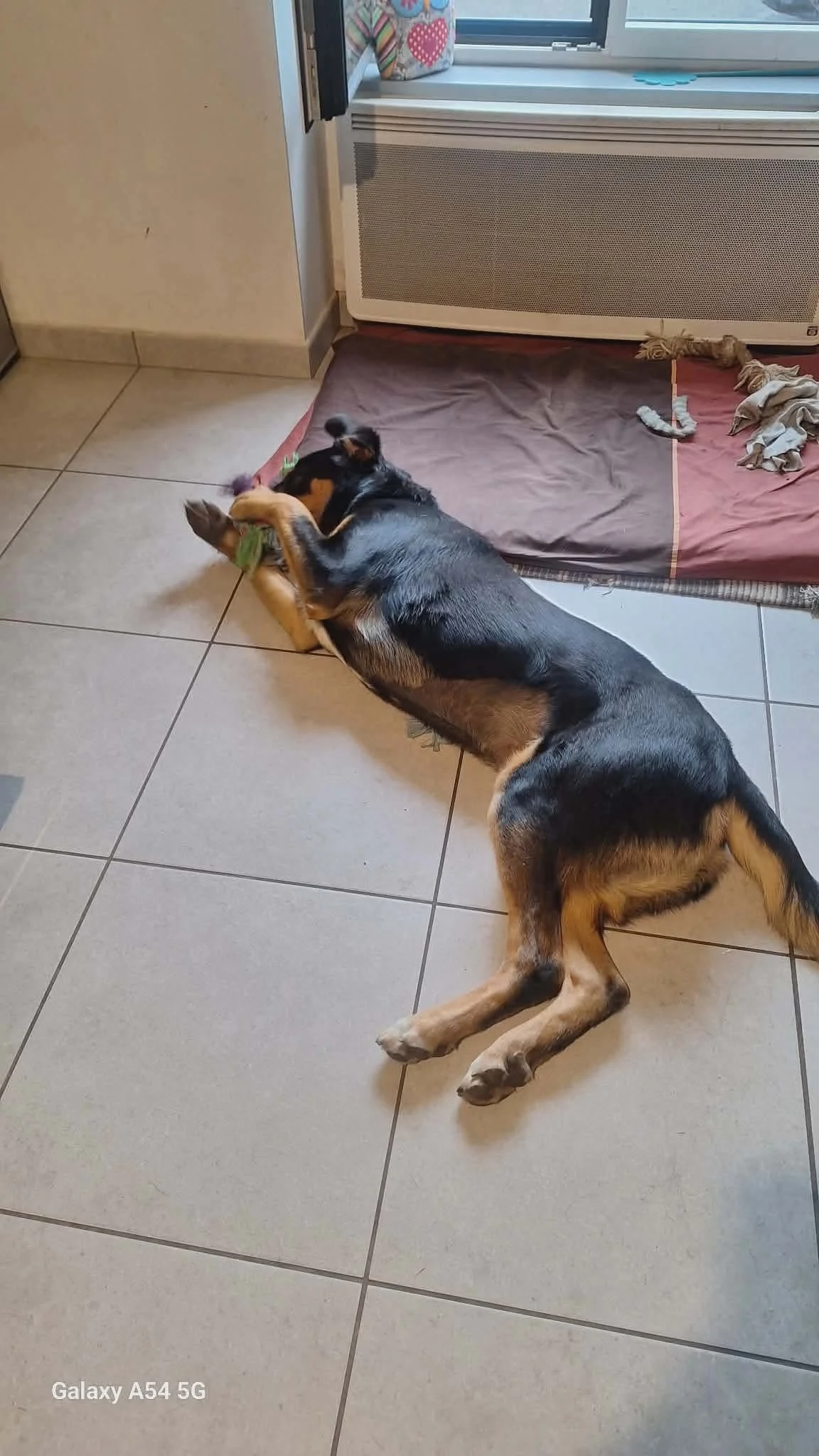 Il est fan de tous les jouets avec une préférence pour les pouet pouet et les corde à ronger. Mais gare à votre tas de bois, ce chenapan aime emprunter une petite bûche pour courir partout avec.