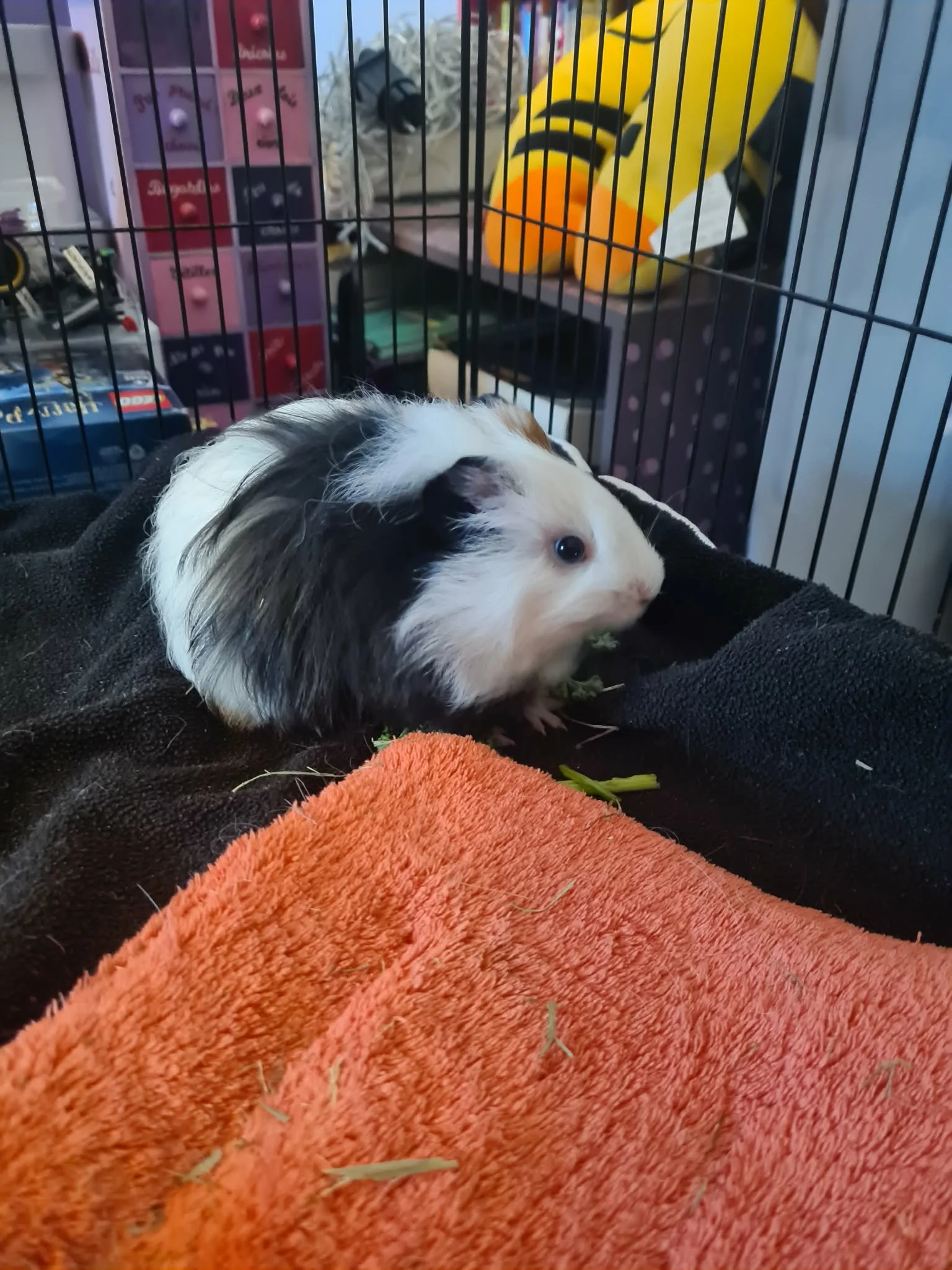 Voici Noisette, une toute jeune femelle cochon d'inde à poils longs tricolore.